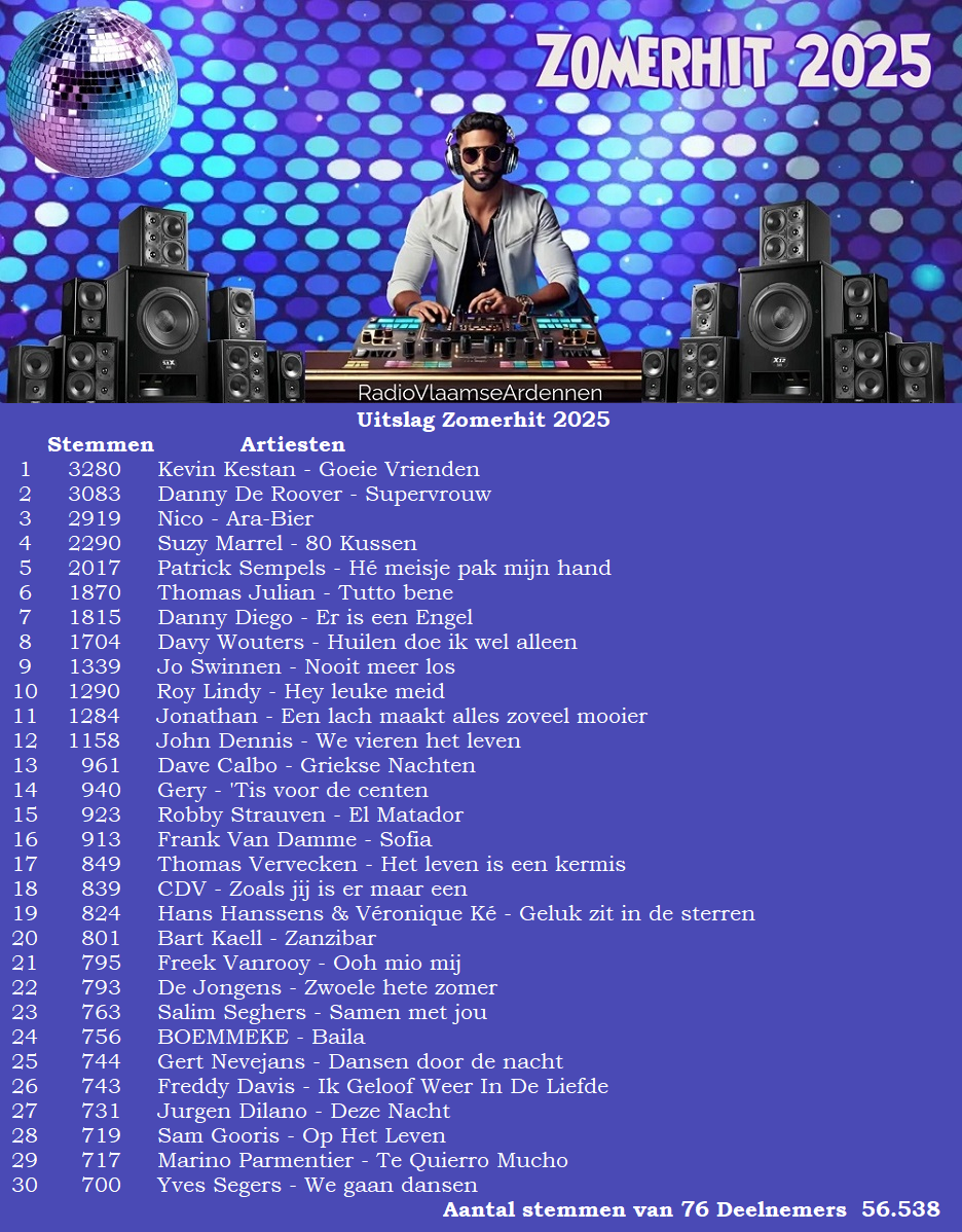 De winnaar van de Zomerhit 2025 is Kevin Kastan met de single Goeie vrienden met maar liefst 3280 stemmen op 76 deelnemers met samen meer dan 56.538 stemmen.